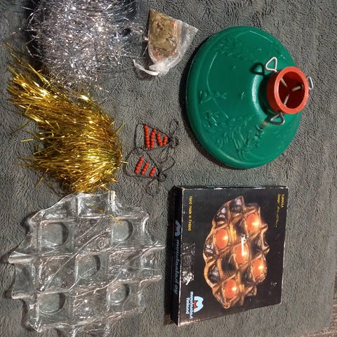 Kuusen tähti, vaaleanpunaiset joulupallot ja lumihiutaleet, hopean väriset nauhat, kolme tonttua