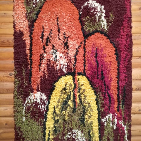Vanha seinäryijy, koko 147cm x 102cm + hapsut. Kaunis seinäkiinnitin kuuluu mukaan