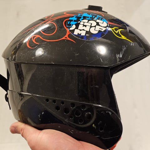 Kypärällä ei ole kaaduttu, mutta on saanut naarmuja säilytyksessä, näkyy kuvissa.