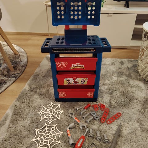 Spidey päämaja rekka äänillä ja oheistarvikkeilla. Kansi taittuu ihan pystyasentoon, jolloin siitä tulee korkea päämaja. Tullut uutena ja lapsi liimaillut tarroja (saa poistettua halutessaan). Kaikki osat tallessa ja äänet sekä valot toimivat. On sen verran iso, että mielellään nouto.
