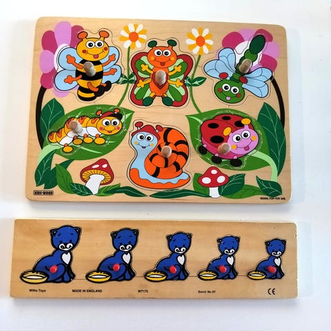 Myydään yhdessä 3 kpl lasten puisia palapelejä. Mukaan saa myös pienen kellopelisoittimen. Yhdessä palapelissä pieni särö (kuva).