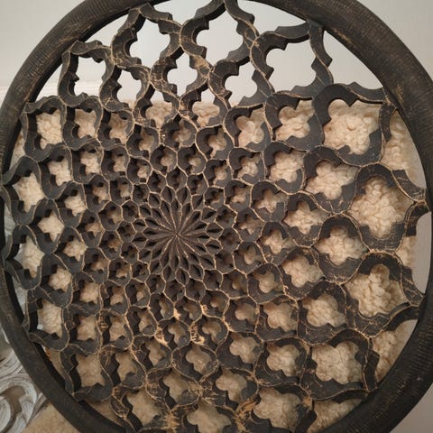 Pyöreä seinäkoriste. Helmenvalkoinen. Pystyhalkaisija sydämestä sydämeen 43 cm ja vaakahalkaisija 38 cm.