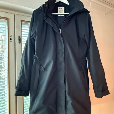 Fjällräven parkamallinen talvitakki. HUppu ja vetoketjullinen sekä napillinen sulkumekanismi. Edessä kolme taskua molemmin puolin, sisällä vielä kaksi lisää.