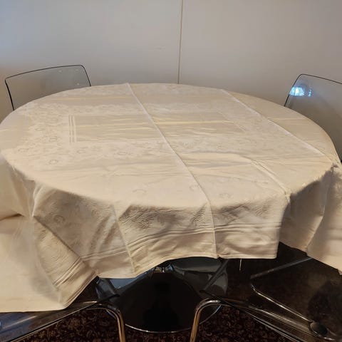 Pyöreä pöytäliina koristereunalla.. toinen puoli silkkinen halk. 130 cm