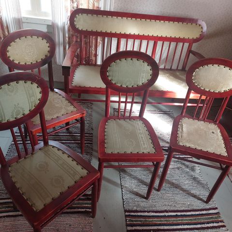Pöytä ja 8 tuolia. Valmistettu puusta, jatkopala 50cm. Tuolien istuimet ja selkänojat verhoiltu vaalealla, kuvioidulla kankaalla. Yksi tuolista käsinojallinen. Todella hyvässä kunnossa.