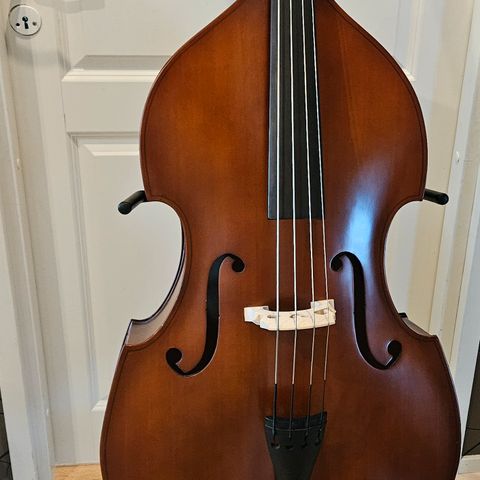 Palatino PSI-05VB 3/4 kokoinen kontrabasso. Saundi karkeahko. Laminoitu rakenne kestää hyvin ilmankosteuden vaihteluja. Joku on joskus hionut otelaudan puulle. Pinta on kestänyt soittoa hyvin. Mensuuri 102 cm, kaikukoppa 112 cm. Käytön jälkiä. Mukana hyvä saksalaismallinen jousi. Nykyinen omistaja on soittanut klassista musiikkia. Ilman trimmausta soitin soveltunee hyvin kansanmusiikkiin yms.
