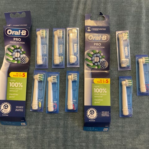 Kaksi Oral-B sähköhammasharjaa ja yksi laturi. Mustan harjan kumi repsottaa, yritetty liimata muttei pystynyt. Muuten harjat ja laturi toimivat moitteettomasti.