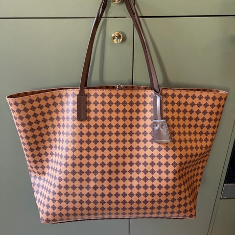 Tilava tummanvihreä laukku, monta vetoketjullista taskua. Koko noin 25x20cm. Hihan kiinnityskohdassa kulumaa, näkyy kuvissa