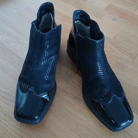 Rieker remonte mustat mokkanahkaiset syksy/talvinilkkurit koossa 42. Nauhalliset. Sisävuori ja pohja villaa. Todella siistit, ehjät, mukavat kävellä. Kuvissa eivät pääse täysin edukseen mokkanahkaisuuden takia, tietynlainen kulumisen näköisyys kuuluu kengille.