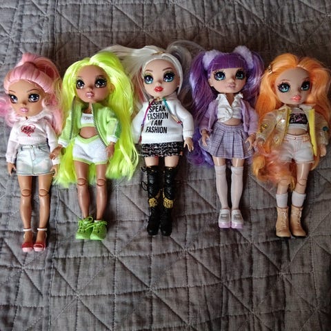 High nuket, joissa on hopeanharmaa hiusväri. Nukilla on yksityiskohtaiset kasvot ja erilaiset asut, kuten vihreä takki ja hopeanvärinen mekko. Nuket soveltuvat keräilyyn tai leikkiin.