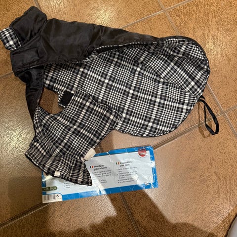 Koiran talvitakki, selän pituus noin 50 cm. Selkään tehty aukko valjaiden lenkille.
