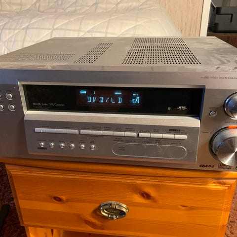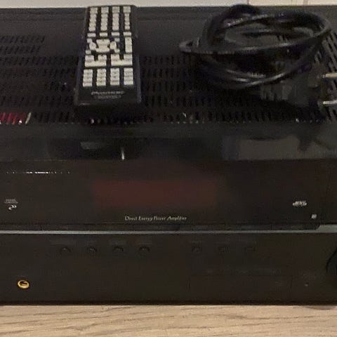 Kotiteatterivahvistin. Laite on täysin naarmuton ja toimii moitteettomasti.