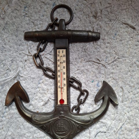 Purjelaivan kohokuviolla varustettu merihenkinen lämpömittarin runko, metallia