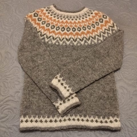 Itselle tehty Riddari (Lettlopi), mutta parin käyttökerran jälkeen pakko todeta että on hartioista itselle liian piukka joten kaarroke ei asetu kauniisti.