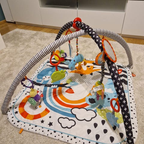 Paljon käytetty leikkimatto. Meille tullut käytettynä tässä kunnossa. Viat ei ole haitannut käyttöä. Potkimis/tavoittelu lauta toimii. Musiikit ja valot ok. Lelut ehjät. Ripustetussa peilissä käytön jälkiä. Muutoin yrittänyt kuvata viat lisäkuviin. HP 5e tai vaihtuu Fazerin siniseen suklaalevyyn.