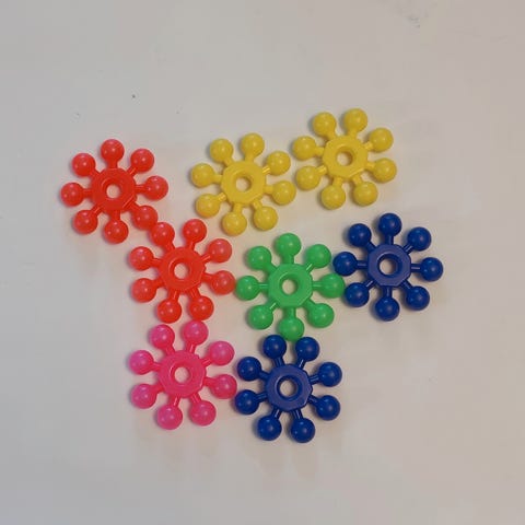 Retro atomi rakennuspalikat lasten lelu, moniväriset muoviset osat, jotka voidaan yhdistää toisiinsa. Sopii lasten leikkiin ja luovaan rakenteluun. 13 kpl. Muutama hampaanjälki löytyy ja yksi uloke hieman haljennut.