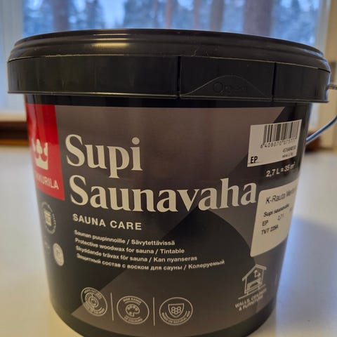 Supi Saunavaha saunavaha, 0,9 litran säiliö. Tuote soveltuu saunan käsittelyyn ja suojaamiseen. Uusi ja käyttämätön, sävytetty kauniilla ajattomalla TVT 215 A.