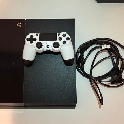 Sony Playstation 4 konsoli valkoisena, mukana kaksi valkoista ohjainta. Pakettiin kuuluu kolme PS4-peliä: FIFA 15 ja 23, Death Stranding sekä Mirrors Edge Catalyst. Konsoli täydellisessä kunnossa, vain muutaman kerran käytetty