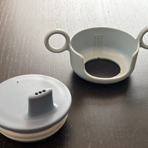 Kahvat käyttämättömät ja kansi muutoin erinomaisessa kunnossa, mutta alareunassa hieman kulumaa, joka ei kuitenkaan näy mukia käytettäessä. Kannessa ei esim. mitään puremajälkiä lapselta.