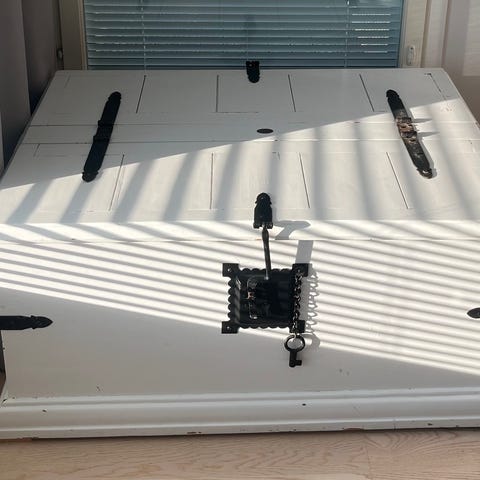 Valkoinen puinen säilytysarkku. Sisälle mahtuu tavaraa ja mukana saa myös koristeelliset osat, jos haluaa ne kiinnittää.