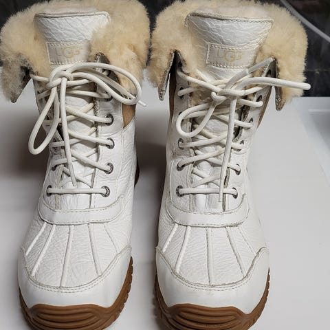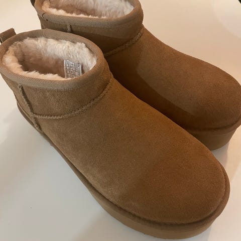 Mukaan myös ruskeat vaihtonauhat ja valkoiset UGG-sukat, joissa takana UGG-logo.