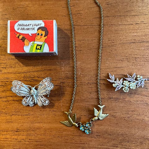 Antiikkinen art nouveau rintakoru. Luulen, että liittyy jotenkin militariaan, kruunu ja lehdet viittaisivat siihen. E b a y s s a tällainen oli myyty 50 eurolla, mutta sieltäkään ei selvinnyt alkuperää sen paremmin.
