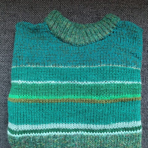 Rakkaudella käsin neulottu vihreä & monivärinen, raidallinen villapaita etsii uutta käyttäjäänsä. Toivon, että tämä villapaita löytää uuden käyttäjän, joka arvostaa käsityötä.