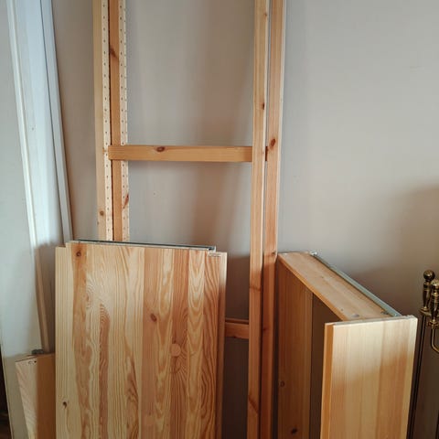 Myydään setti, jossa uudenveroiset Ikean Ivar hyllyn päätytikkaat, 2 kpl, korkeus 124 cm ja syvyys 30 cm sekä hyllyn sinkitty tukiristikko 100 cm. Paketissa myös kiinnityshelat, joilla hyllyn voi kiinnittää seinään.