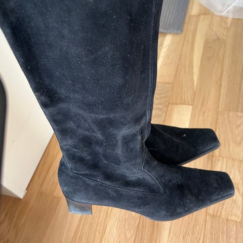 Alle 5 kertaa käytetty, mokkanahkaa, korko n.6.5cm, varren pituus kantapäästä n.48cm, pohjeympärys n.40cm, kuvassa näkyy jälkiä varren yläosassa sisäpuolella, ei näy käytössä, muuten tosi siistit, kapea lesti.