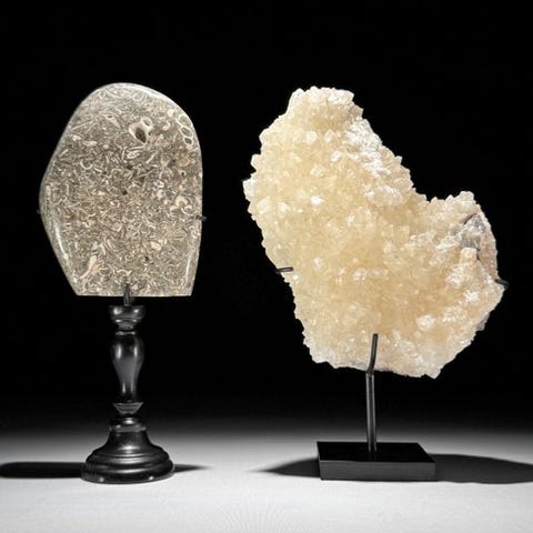 Upea pariskunta turritella-munamuotoisia ja kvartsikristallipalloja, jotka on asetettu räätälöityihin jalustoihin.