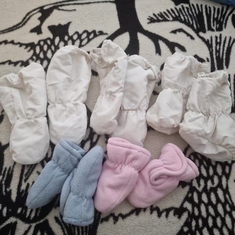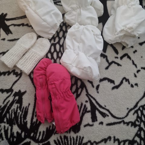 Haalarit, myssyt, hanskat, hanskojen klipsut, kengät(koko 17/18).