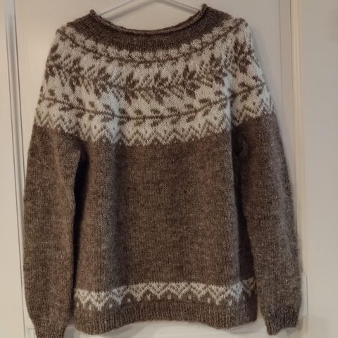 Myydään uusi, siisti islantilaisesta Lettlopi langasta kudottu neule. Kuvassa mitat. Koko naisten XS/lasten 150cm.