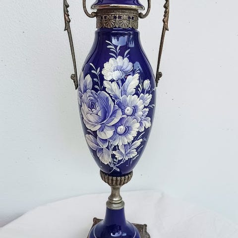 Art Nouveau -kashpot, valmistettu keramiikasta, päävärinä vihreä, kauniisti täydennetty harmaalla ja koristeellisilla ruusuilla. Suunnittelu on vahvasti tyylitelty ja esittää voimakasta Art Nouveau -estetiikkaa, virtaavia linjoja ja luonnollisia muotoja, jotka ovat tyypillisiä tälle ajanjaksolle (noin 1890–1910).
