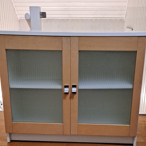 Askosta ostetut lipastot/kaapit , mdf levyä. Lasihyllyihin led valot. 2kpl samanlaisia kaappeja. Kappalehinta 25e