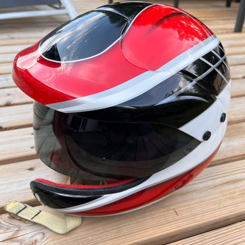 Stilon kypärä, kokoa 59L. Hans klipsit ja leima SA 2005, eli ei käy AKK:n kisoihin. Tästä siisti kypärä harrastuksiin. Ainoa moite kuvassa 6, hieman irronnut reunanauha. Suojapussikin löytyy.