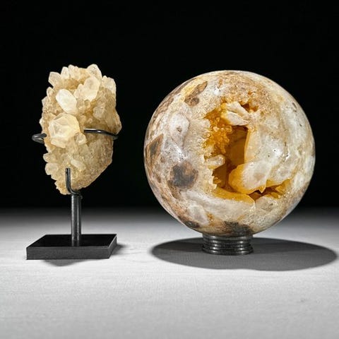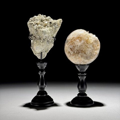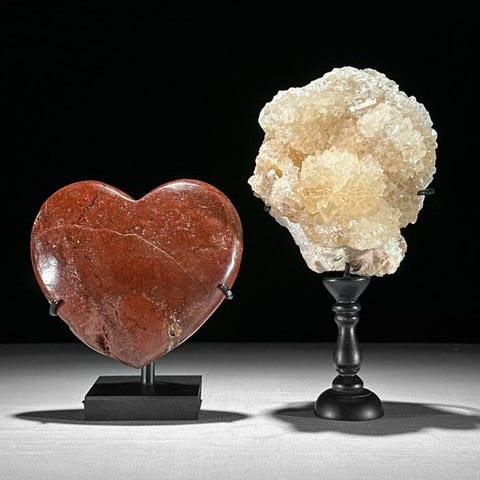 Upea kalkkiittikristallikimpale ja turritella-sydämen muotoiset kivet räätälöidyillä jalustoilla.