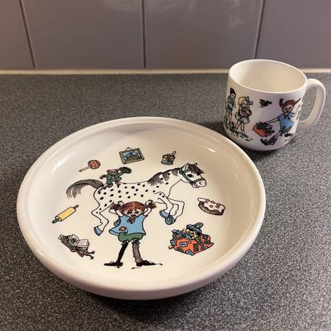 Peppi Pitkätossu lautanen ja kahvikuppi