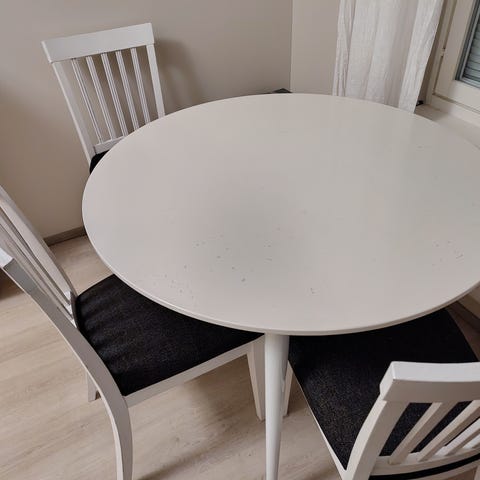 Pöytälevyssä on käytön jälkiä ja naarmuja, mutta pöytä on täysin tukeva ja toimiva. Sopii hyvin käytettäväksi esimerkiksi pöytäliinan kanssa tai helposti päivitettäväksi kontaktimuovilla. Tuolit ovat siistikuntoiset ja mukavat istua.