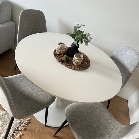 Myydään ruokailuryhmä muuton vuoksi. Kokonaisuuteen kuuluu pyöreä ruokapöytä (halkaisija 100 cm) sekä neljä samettipintaista tuolia.