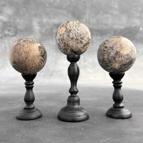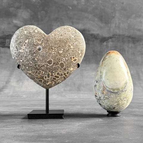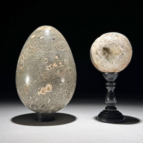 Upea turritella-vapaamuoto ja kalkkikivikristallikimpale räätälöidyillä jalustoilla.