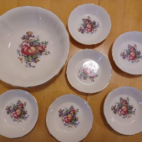 Arabia lounaskulhot ja kastikekaadin posliinia kukkakuvio