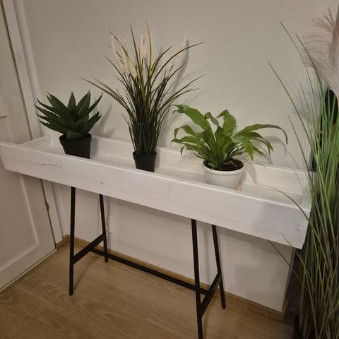 Fiftari metallinen string kukkapöytä muovinarureunoilla. Mustavalkoinen retro levy ok kunnossa, ei ole taipunut kuten yleensä. Metalliosissa jossain kohtaa ruostetta ja maalitahroja, mutta ei ole haitannut itsellä kukkien kanssa.