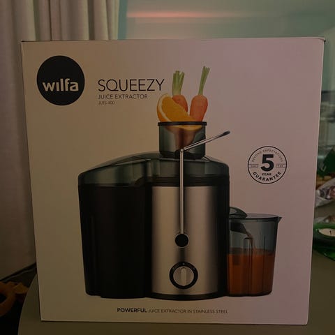 Wilfa Squeezy mehulinko, valmistettu ruostumattomasta teräksestä ja muovista, väriltään musta. Laite on suunniteltu mehustamiseen ja sisältää mehukannun. Käyttöjännite 220-240 V, teho 1500 W.