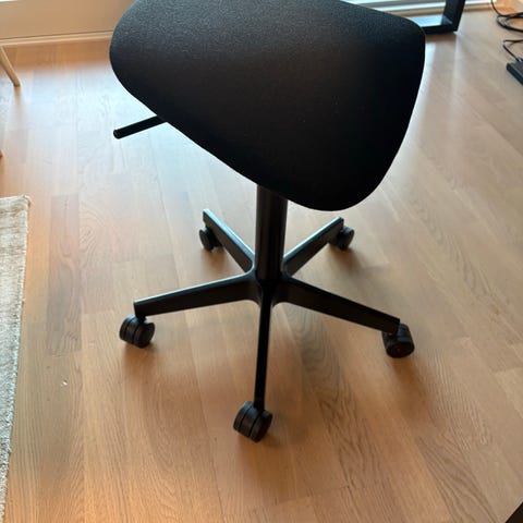 Vähän käytetty, todella hyväkuntoinen Isku satulatuoli sinisellä nahkaverhoilulla ja valkoisella metallirungolla. Pyörät ja säädettävä istuinkorkeus.