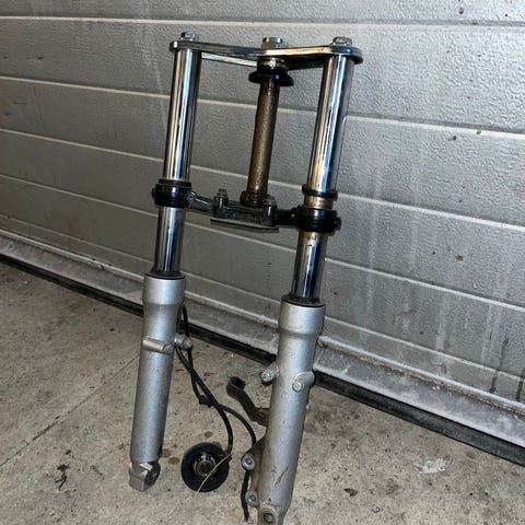 Siitäpä hyvä Wandamotorin +4 takahaarukka. Mukaan jarrutanko, iskareiden kiinnitys pultit ja ketjun kiristimet. Ketjut hieman syöneet takahaarukkaa.