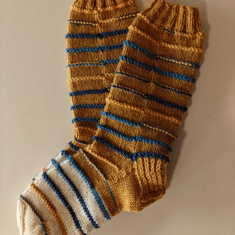 Vain kokeillut, käsintehdyt, pitkävartiset (polvipituiset) turkoosi-valko-harmaat villasukat n. 37 koossa. Kunto siis kuin uusi, en muista onko näitä pesty. Vahvistettu kantapää ja laadukkaista sukkalangoista kudotut.