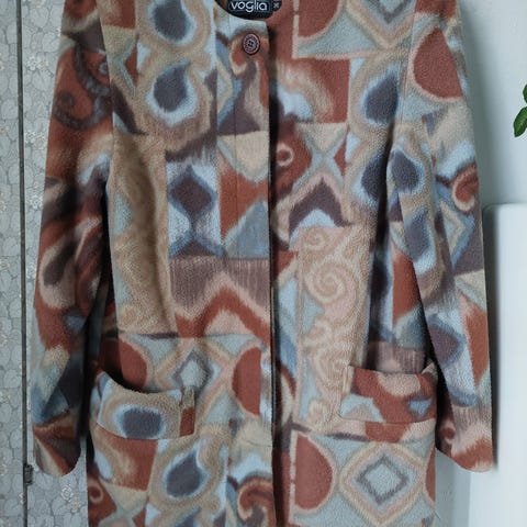 Siisti eläinkuosia jäljittelevä jakku vetoketjulla ja sivutaskuilla. Hihansuut ehjät. Vähän käytetty. Olka-helma 56cm, kai-kai 50cm.