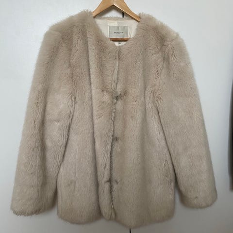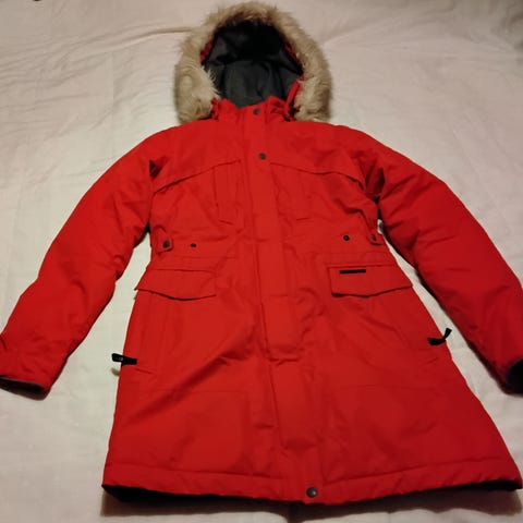 Covert Overt Talvitakki naisten koko 36, beige väri. Takki on suunniteltu talvikäyttöön ja siinä on irrotettava huppu, jossa valkoinen tekoturkisreunus. Takissa on pitkähihainen malli ja edessä kaksi suurta taskua. Hihat ovat varustettu joustavilla resoreilla, jotka estävät kylmän ilman pääsyn hihojen sisälle. Ainoa käytön merkki hihan suussa, katso kuva.