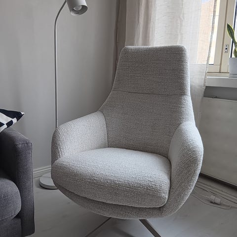 Tämä lepotuoli lisää huoneeseen pehmeää ilmettä ja kutsuvaa tunnelmaa, ja sen muotoilu tekee siitä paitsi istumapaikan myös näyttävän koristeen.