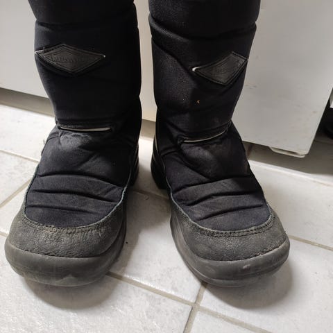 Todella hyvät kuomat. Ei juurikaan kulumaa. Meillä kahdet, joten eivät ole olleet käytössä meillä. Lämpimät ja tukevat talvikengät lapselle. Kestää loskaa, lunta ja vettä.